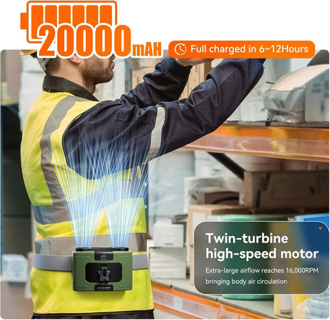 40H Long-lasting Cooling: This waist fan features a built-in 20000mAh rechargeable battery and a powerful motor, providing powerful but comfortable airflow. It can last up to 8-40 hours on a single charge. Perfect for use in jobsite outdoor garde