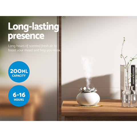 Relax and absorb calm and soothing vibes at the touch of a button with a Devanti Ultrasonic Aroma Diffuser. Delicate white ceramic is carefully moulded into an elegant lotus shape for this Bauhaus-inspired piece. Delightfully aesthetic, the diffuser works in three ways: as a humidifier, purifier, and aromatherapy device. The device uses ultrasonic technology to turn your favourite essential oils and water into a smooth, cool, aromatic mist to help restore and maintain your aura. The diffuser comes with two mist frequency adjustments, two levels of brightness and 2 timer settings to meet your exact preferences. The low water auto shut-off automatically detects water levels and turns off the device when empty, so you don’t have to worry about damaging the device with prolonged use. Bring life back to stale air, cover stubborn odours, and revitalize your home with a Devanti Ultrasonic Aroma Diffuser.