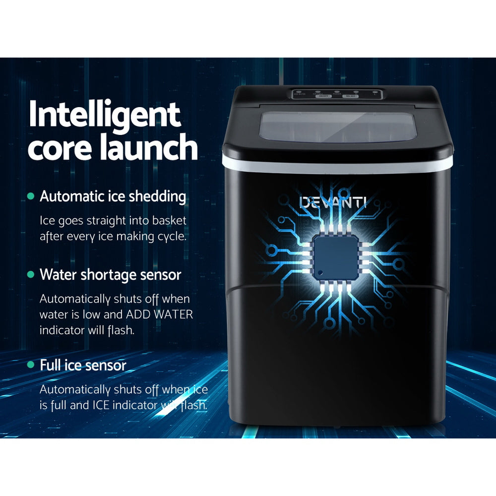 Looking for ice in a hurry? Meet our Devanti Ice Maker! Quickly produce 9 ice cubes in 6-13 minutes, with the flexibility to choose from 2 sizes. It's loaded with smart features like water shortage and ice full alarms, plus energy-saving technology through Freon-free refrigerant and enhanced heat dissipation. Its sleek, compact design fits anywhere, and with its easy-to-use controls, you’ll be enjoying cold beverages in no time. Ice at home has never been cooler!