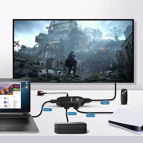 The HDMI switch comes intergraded HDMI output cable for more stable connection to your TV. No lag, no loss of picture quality and sound quality, and can bring the ultimate high-definition experience.