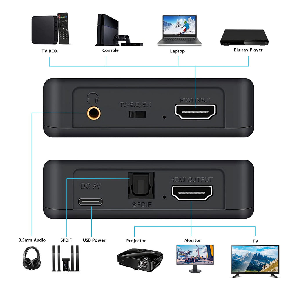 - Optical SPDIF and 3.5mm audio output extracted from HDMI input