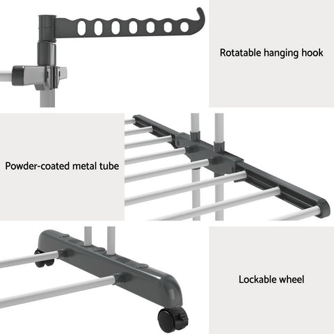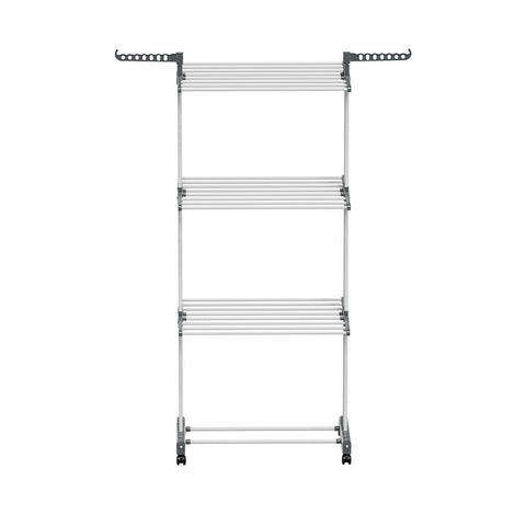 Prepare for laundry day with the heavy-duty, 3-tier Clothes Drying Rack from Artiss. The rack is constructed from sturdy powder-coated metal tubing and solid plastic and can support up to 20kg of laundry. Not only are there 3 generous tiers to hang clothes, linens and undergarments, but there are two handy side hooks that will support various hangers, and two lower bars allow for additional storage. Generous spacing between each bar allows for proper airflow, helping your clothes dry fast. The entire unit is incredibly lightweight and portable, and four convenient lockable wheels can help you move around and keep in one place as required. Once laundry day is over, simply fold the unit and store it away until needed. For fast and convenient clothes drying, look no further than the Artiss Clothes Drying Rack.