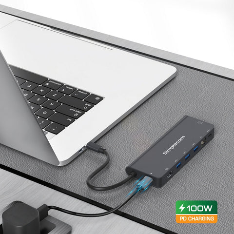 The USB-C PD Port can charge your connected laptop while other ports are working. The USB-C port supports PD3.0 and up to 100W Power Delivery charging.