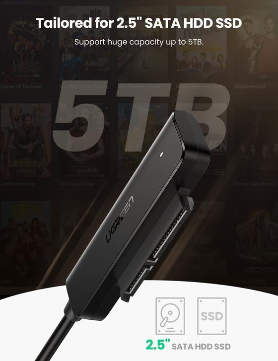 The External Hard Drive Adapter Reader features latest SATA III 6Gbps internal and USB 3.0 5Gbps external and delivers blazing data transmission rate up to 5Gbps. Enhanced with accelerated transmission protocols-UASP (USB Attached SCSI Protocol) and TRIM, the SATA 3 USB Adapter enables you to take the full advantage of SSD drives and realize 70% faster than traditional HDD drives.