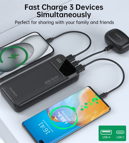 With 1 USB-C, 2 USB-A output, this protable charger can fast charge 3 devices simultaneously.