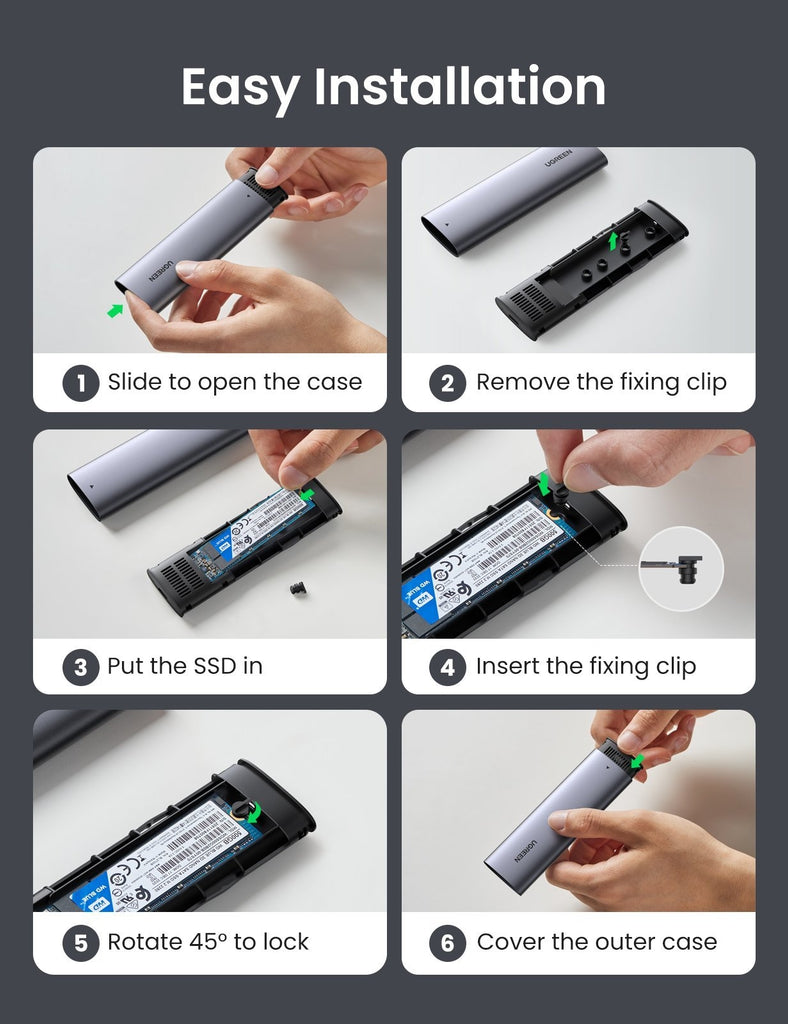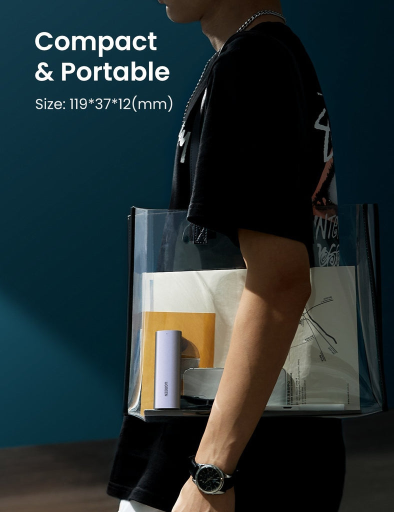 UGREEN M.2 USB-C Enclosure is designed to house an M-Key or M+B Key NVMe PCIe SSD and turn it into a portable USB 3.1 external drive for maximum utilization. Tool-free and no driver needed, just plug and play. Ideal for cloning files, backing up data, reusing old M.2 SSD, expanding storage space.