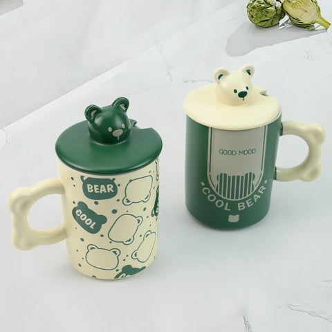 2 Set High-Fired Ceramic Porcelain Mug Set with Lid Bear Tea Spoon 400ml Green
