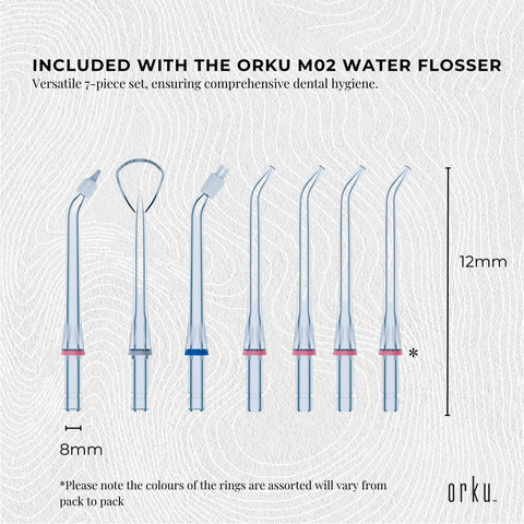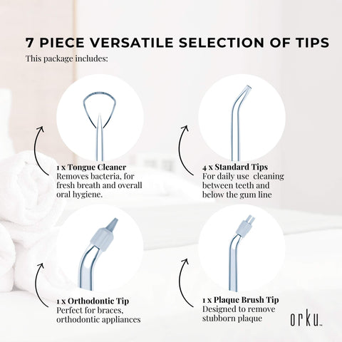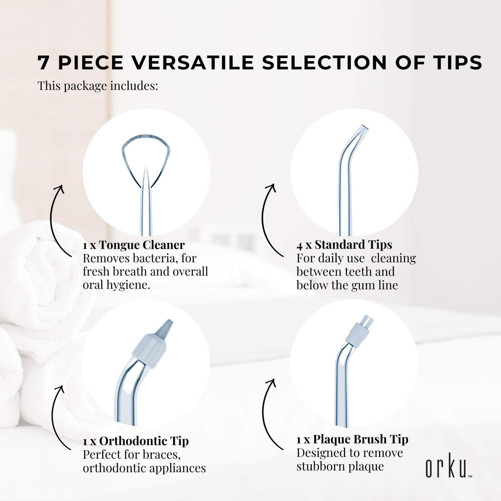 • Comprehensive Nozzle Selection: Comes with 7 nozzles, including 4 standard tips, a plaque brush tip, an orthodontic tip, and a tongue cleaner, catering to all your dental care requirements.