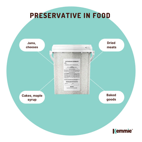- Preservative in food (E202) - jams, cheeses, dried meats, cakes, maple syrup, baked goods