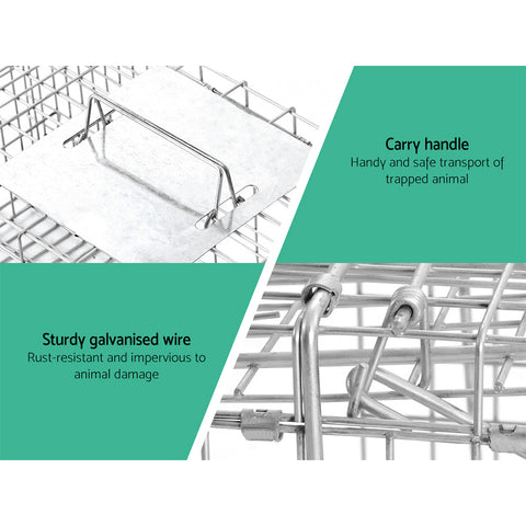 Made from quality rust resistant galvanised iron wire, this humane animal trap cage is built to last for years. Featuring spring loaded door trap with protected handle and an automatic locking system that is swift in operation, this cage is designed to ensure safety of both animals and users. Perfect for removing pest animals in backyard and capturing pest alive. It has a collapsible design and can be folded away quickly for easy storage and transportation.