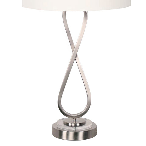Introducing our contemporary metal table lamp - a great piece of modern design. The lamp's exquisite nickel finish shines with sophistication, enhancing its aesthetic allure. At the same time, its white linen drum shade complements the metal frame, casting a soft, ambient glow that transforms any space. Resting on a round metal base, this lamp exudes stability and style, making it a captivating addition to your home dcor, perfect for elevating your interior ambiance. Illuminate your space with this beautiful piece.