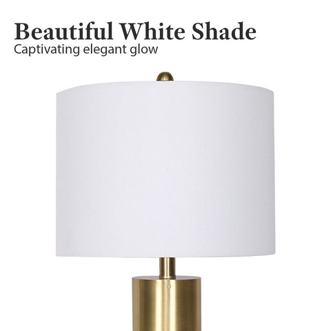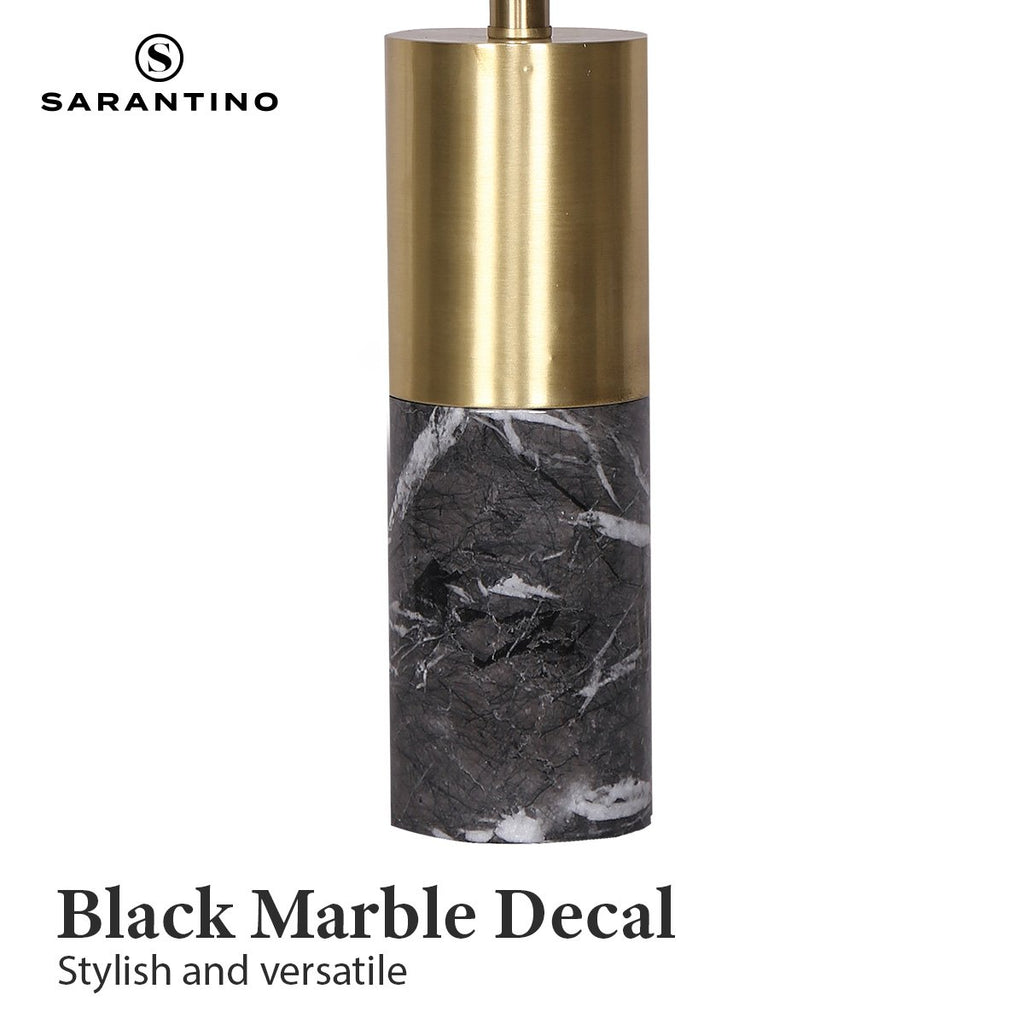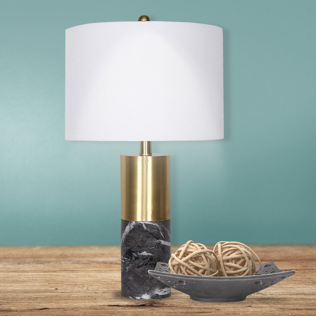 Elevate your modern home with our Metal and Marble Table Lamp, a seamless blend of luxury and contemporary appeal in design. Meticulously crafted, the lamp boasts a stunning golden brass metalwork that exudes elegance and the refined black marble decal introduces a dash of sophistication to any room. Crowned with a white drum shade, this lamp harmonises chic aesthetic and practicality, casting a gentle and welcoming glow over your space.