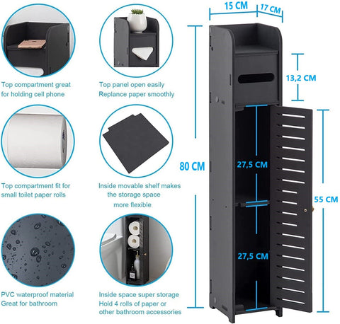 - Toilet Roll Holder: toilet paper holder fits anywhere of your house,open top compartment replacing paper,great for dispense & store toilet paper; Small Size: 80H x 15W x 17D cm great for small spaces, please carefully check before purchase