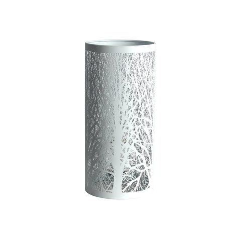 The White Forest Table Lamp is a beautiful decorative feature to add a touch of grace to a home. The abstract design of the lamp includes a cylindrical metal shade that is elegantly pressed to represent a forest of trees.