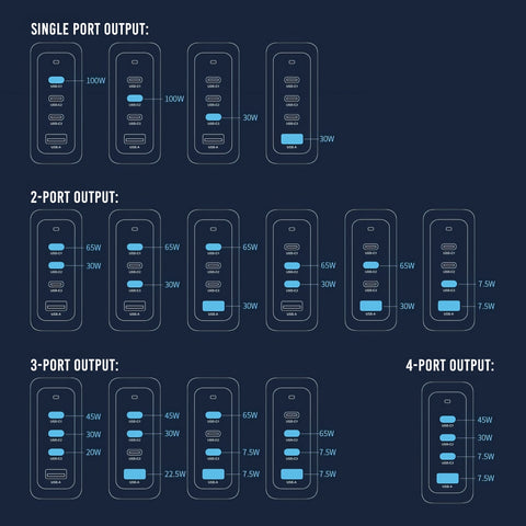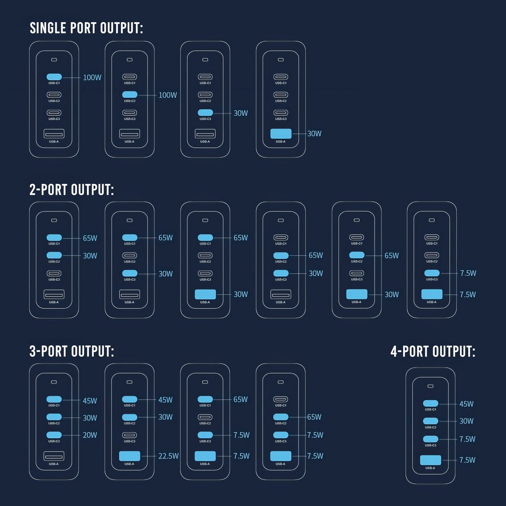 USB-C1+USB-C2+USB-C3+USB-A Output: 45W+30W+7.5W+7.5W