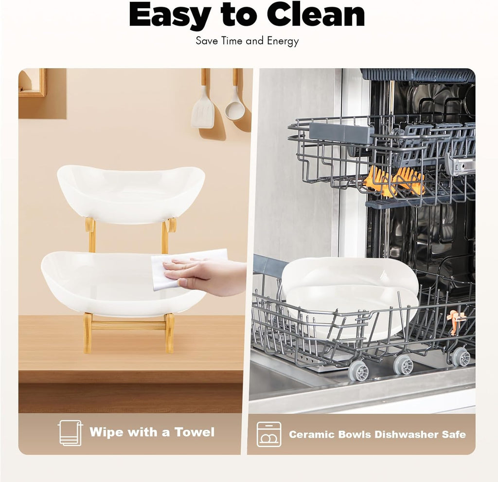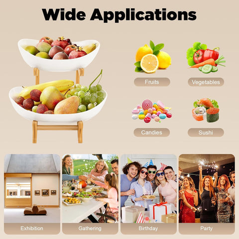 - ELEGANT TIERED DESIGN: The 2-tier ceramic fruit bowl features a space-saving vertical layout with smooth white bowls and a natural bamboo stand, perfect for adding a touch of charm to your kitchen counter or dining table.