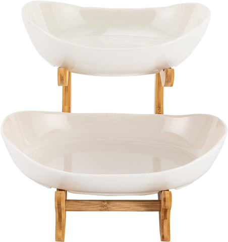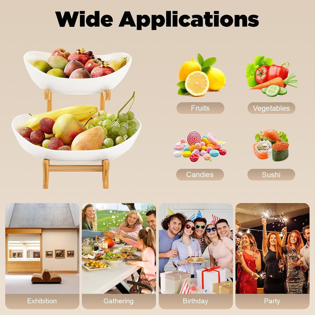 CARLA HOME 2-Tier Ceramic Fruit Bowl Basket with Bamboo Stand for Kitchen Counter, Snack Tray, Dessert Server & Vegetable Storage Rack