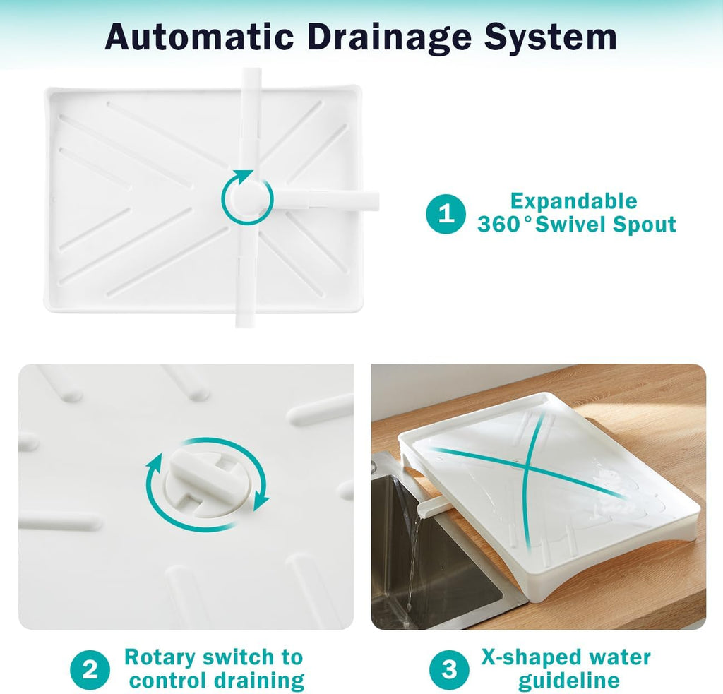 - BUILT-IN DRAINBOARD WITH SWIVEL SPOUT: Includes an auto-drain tray and 360° rotating spout to channel excess water directly into the sink, keeping your kitchen counter clean and dry at all times.