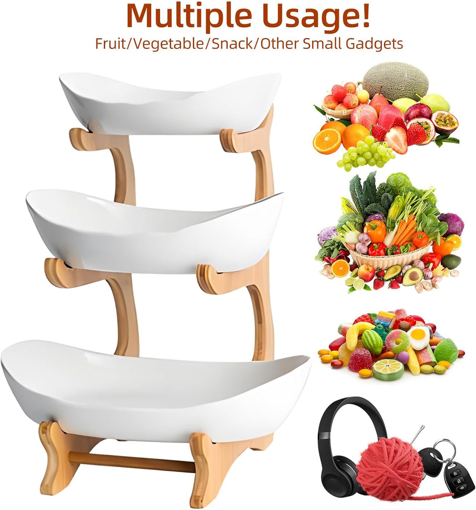 CARLA HOME 3-Tier Ceramic Fruit Bowl Basket with Bamboo Stand for Kitchen Counter, Snack Tray, Dessert Server & Vegetable Storage Rack