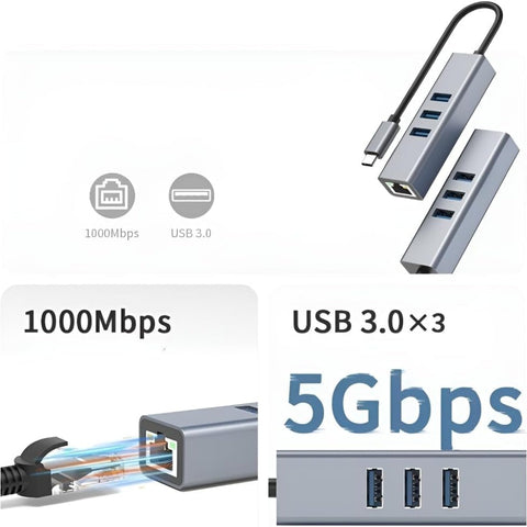 USB C to Ethernet Adapter with 1000Mbps Gigabit RJ45 and 3xUSB 3.0 Ports