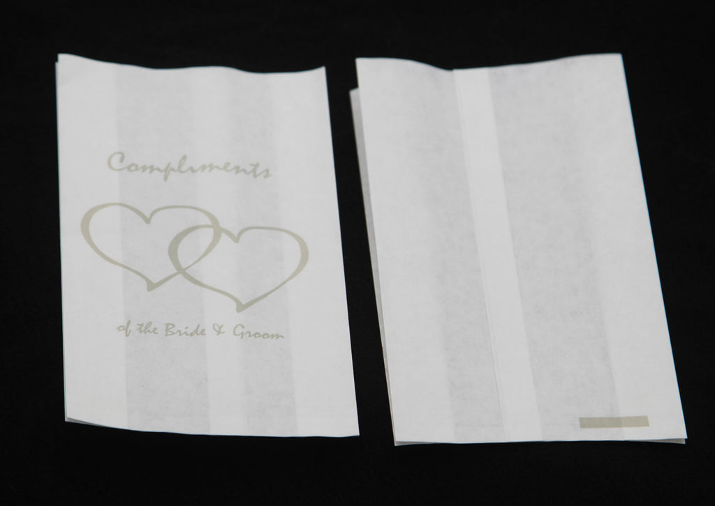 This pack includes 200 greaseproof wax paper bags, each adorned with an elegant heart design that complements a variety of wedding themes. Measuring 8 cm x 15 cm, these bags are the perfect size for packaging individual slices of your wedding cake.
