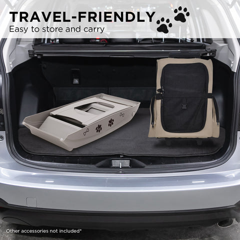 This pet ramp folds flat, with a low profile for easy storage in your home, car or garage. Each step has a non-slip mat to keep little paws secure as they climb. Choose from three elegant colours and find the perfect match for your furry pals!