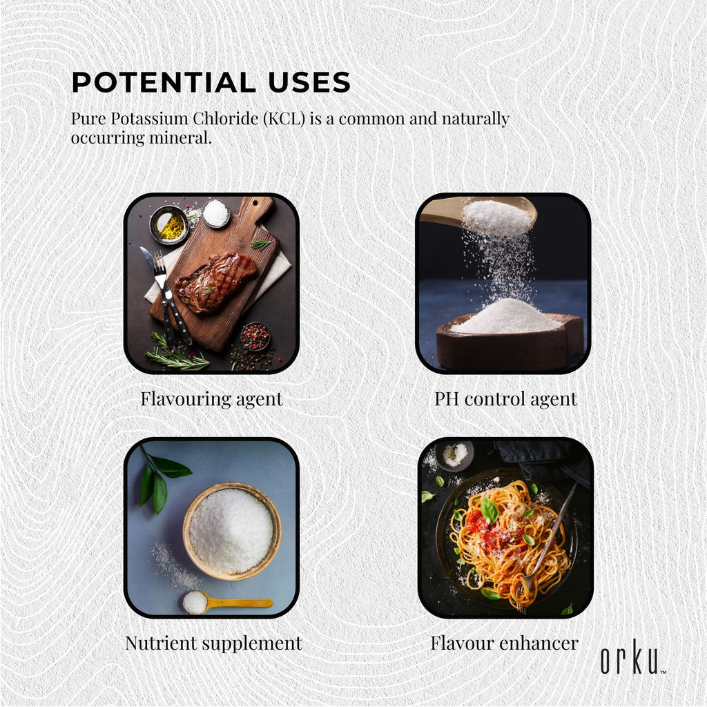 Pure Potassium Chloride (KCL) E508 is a food grade powder that comes in a resealable bucket tub. It is a common and naturally occurring mineral. It is generally used to provide potassium enrichment in foods and as a salt replacer to reduce the sodium content in food.