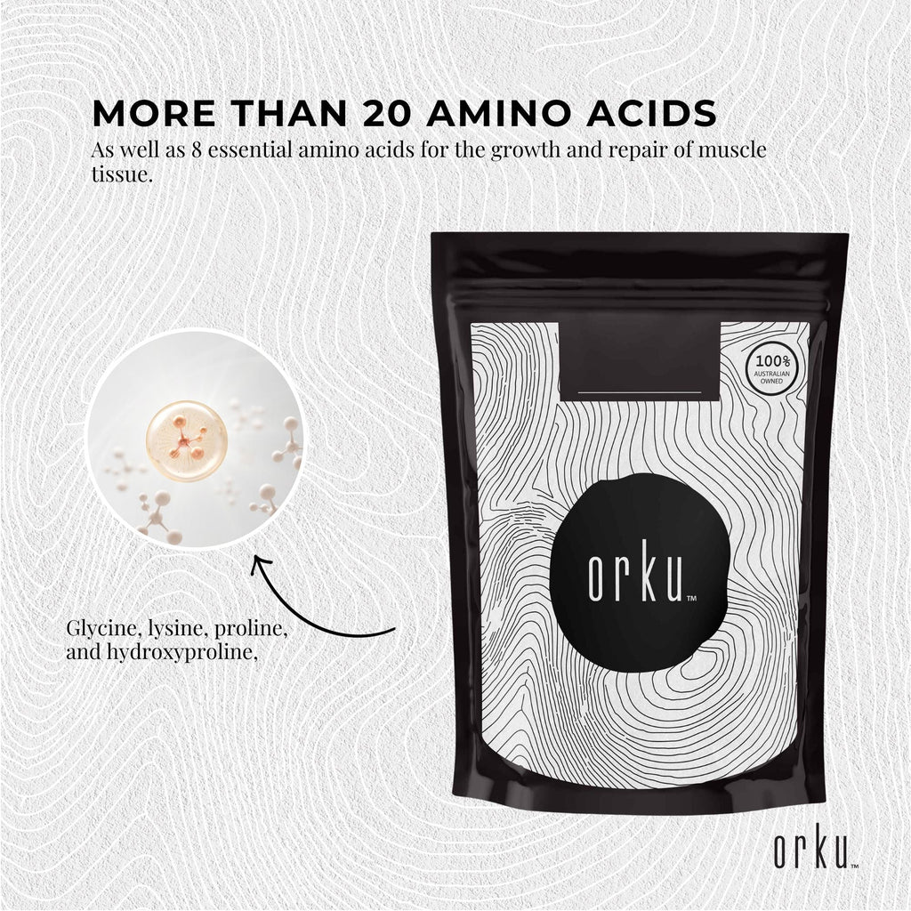 Orku Bovine Collagen Hydrolysate is a bioactive peptide protein that supports the body's own collagen found in bones, joints, skin, hair, and nails.
