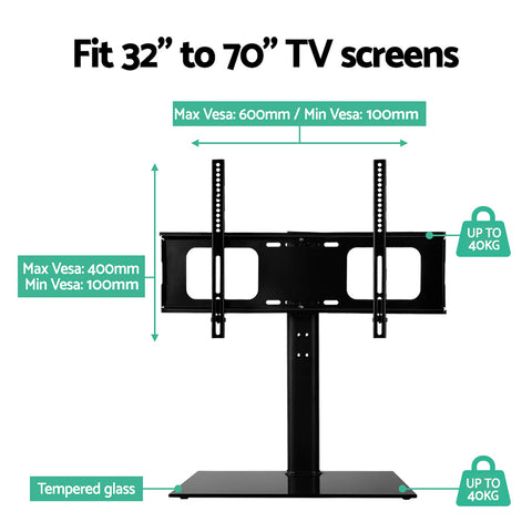 Comprising a strong tempered glass base and a solid metal frame, the Table Top TV Stand is perfect for mounting any TV screen between 32 inch and 70 inch. It is also compatible with various VESA measurements. The integrated design simply looks stunning, especially with its sleek black finish and easily sits on any flat furniture with minimum fuss. The TV Stand design is also such that you can also run cables behind the TV neatly for a well-concealed look. Better still, TV screen can swivel up to 35 degree on either side for your preferred viewing spots. Not least, you can safely place a sound bar or mini component system on the tempered glass base to complete a great entertainment centre.