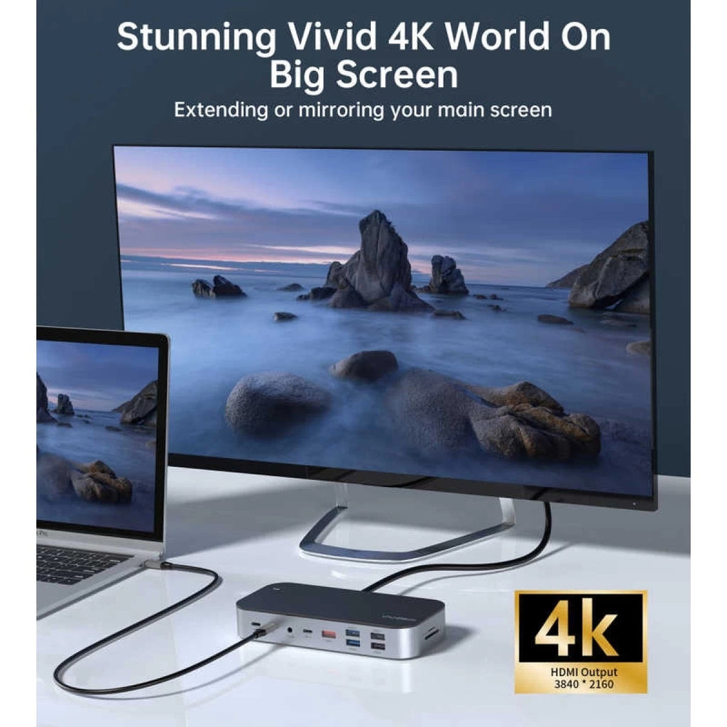 Equipped with one PD3.0, one USB-C (host), one 3.5mm Audio & mic, one USB-C data, one USB-A 3.1, tow USB-A3.0, two USB-A2.0 one VGA, two HDMI, one DP, one RJ45 and one SD&TF card, this USB-C Hub turns PC laptop into a mobile workstation.