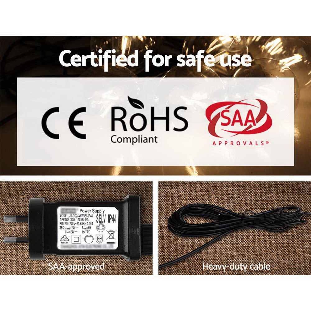 Our Jingle Jollys Festoon String Lights are great not only for wedding and birthday parties or special events, but also for creating a warm, inviting ambience with its bright and mellow glow. Suitable for both indoor and outdoor use, its IP44 rating means that it can be used in the rain and all weather conditions. Each bulb draws a very low voltage and is placed 90cm equally apart from each other throughout its 50m length for an even distribution of illumination and brightness. Not least, the each bulb has a 20,000 hours lifespan so that you can get to use the string lights for quite a while.