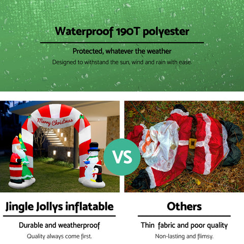 Add festive charm to your home with our Jingle Jolly Christmas Inflatable. Crafted with water-repellent and UV-resistant materials, it is perfect for indoor and outdoor use. The built-in air blower ensures effortless inflation. For quick storage, simply unzip and deflate. Pegs and ropes are also included for secure ground anchoring, bringing you peace of mind. Create a magical holiday display effortlessly with this delightful inflatable centerpiece!