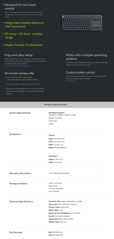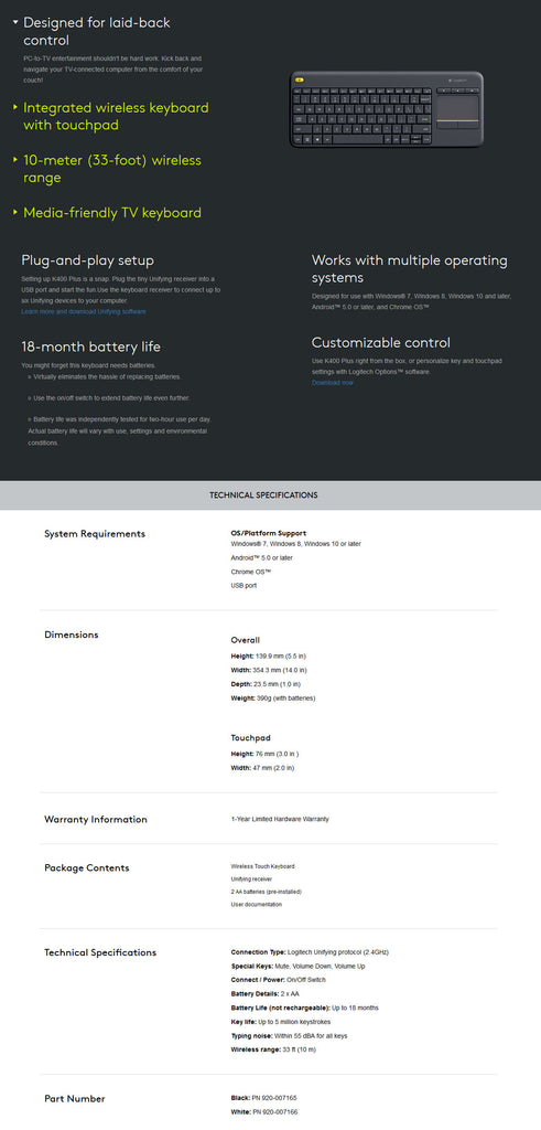 Features: Logitech K400 Plus Wireless Touch KeyboardBlackAll-in-one Keyboard and Touchpad10 Metre Wireless Range18-month Battery Life920-007165