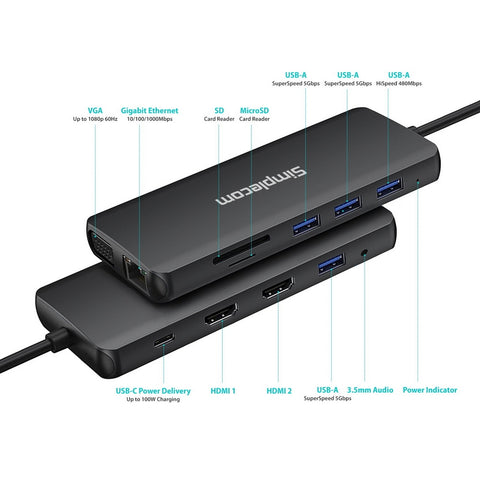 A powerful all-in-one USB-C docking station with dual HDMI, VGA outputs, 100W PD charging port, Gigabit Ethernet Port, SD/MicroSD Card reader, 3.5mm audio output and 4 port USB hub (3x SuperSpeed 5Gbps USB ports and 1x HiSpeed 480Mbps USB port).